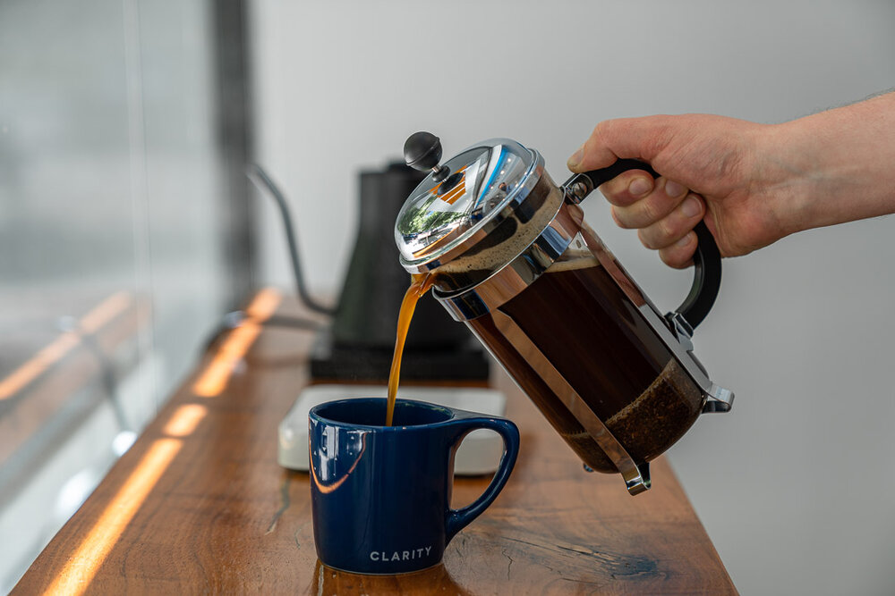 - Sau khi đã ngâm đủ thời gian, hãy đặt khuôn lọc lên và nhấn xuống. Lần này, cà phê sẽ được đẩy qua bộ lọc và lọt vào bình ngâm dưới dạng nước cà phê.