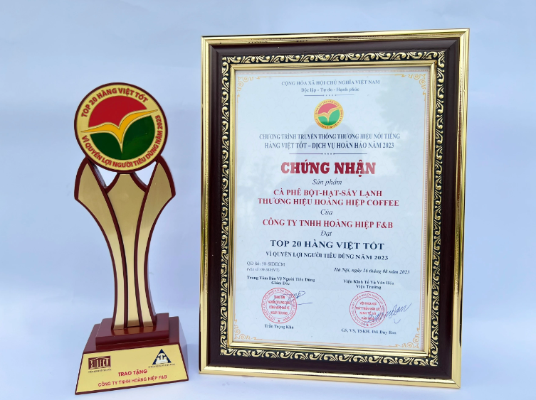 Hoàng Hiệp Coffee – đơn vị cung cấp cà phê hạt rang mộc uy tín và chất lượng trên toàn quốc. Chúng tôi tự hào về sản phẩm cà phê bột – hạt – sấy lạnh của mình khi vinh dự đón nhận Top 20 Hàng Việt Tốt vì quyền lợi Người tiêu dùng 2023 được vinh danh vào ngày 19/8/2023 tại Thủ đô Hà Nội.