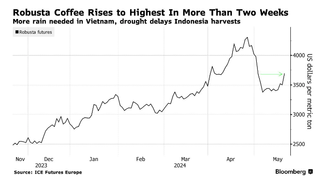 Giá cà phê robusta tăng tới 7%, trong khi cà phê arabica tăng 6%. Giá phê robusta, nguyên liệu làm cà phê hòa tan, đã tăng mạnh trong năm nay do hạn hán ảnh hưởng đến sản xuất ở Việt Nam, quốc gia có sản lượng lớn nhất thế giới. Mưa đã giúp cải thiện bức tranh nguồn cung, nhưng vẫn cần nhiều hơn nữa.