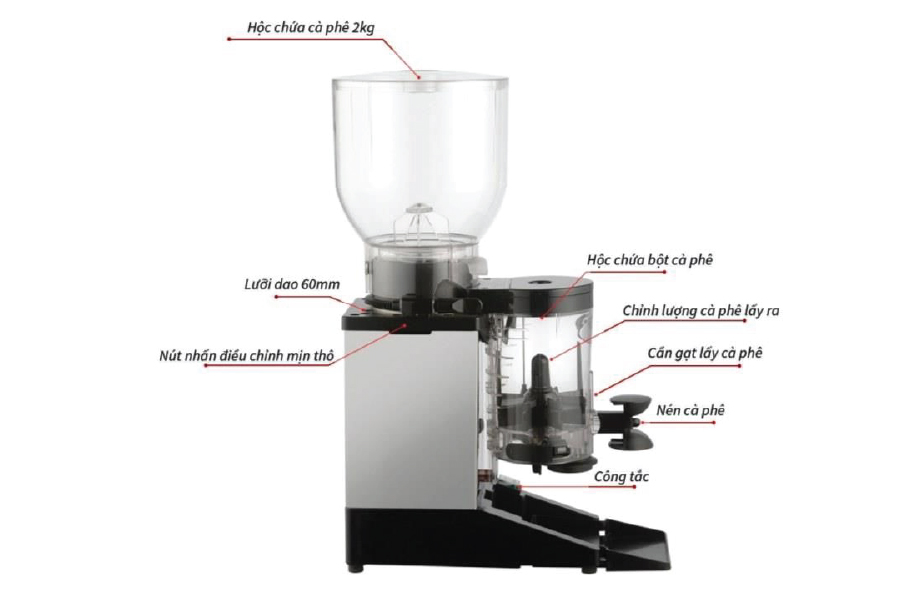 - Phễu chứa cafe được làm từ nhựa cao cấp có khả năng chứa khoảng 2kg hạt cafe. Ngăn chứa cafe và bột cafe thành phẩm được làm bằng nhựa trong suốt giúp bạn quan sát dễ dàng